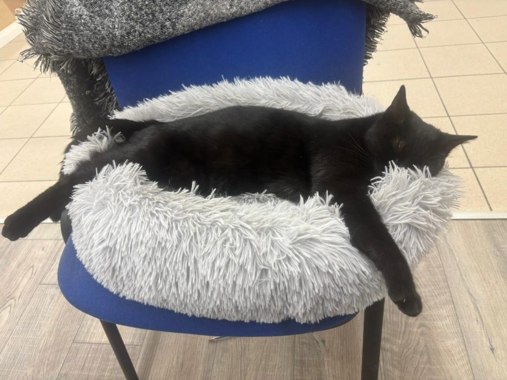 Elle s’est imposée à pas de velours comme un cadeau de Noël imprévu dans les locaux et la vie des employés en décembre 2024. L’arrière du site en contact direct avec les champs est un véritable paradis pour les chats sauvages. « Et ce chaton noir au regard perçant a été le seul à s’aventurer un peu plus près des hommes » raconte Maryline amoureuse des chats et devenue officiellement « sa maman. » Avant bien sûr il aura fallu l’amadouer, l’attraper, le sociabiliser et bien sûr la faire stériliser tout en la couvrant de jouets. MiouMiou aujourd’hui est clairement passée du statut de chat sans domicile fixe à princesse en logement surclassé dans un panier moelleux .